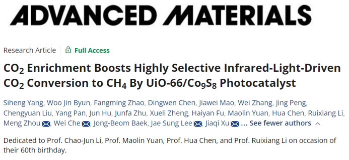 该研究成果以“CO2 Enrichment Boosts Highly Selective Infrared-Light-Driven CO2 Conversion to CH4 By UiO-66/Co9S8 Photocatalyst”为题发表在《Advanced Materials》上。太阳集团2007为论文署名的第一单位,太阳集团2007徐嘉麒副研究员(专职科研),韩国蔚山科学技术院Jae Sung Lee院士、车伟博士,中国科学技术大学的周蒙教授为该论文的通讯作者,太阳集团2007硕士研究生杨思恒、韩国蔚山科学技术院Woo Jin Byun博士,中国科学技术大学的研究生赵方明为该论文的共同第一作者。特别感谢国家自然科学基金委、四川省自然科学基金、国家留学基金委员会、国家市场监管总局科技项目和太阳集团2007的经费支持。同时,感谢太阳集团2007化学专业实验室综合训练平台的杨凤老师、齐悦老师、邓冬艳老师、李静老师,以及太阳集团2007分析测试中心的吴莉老师和谢晓滨老师的测试支持。