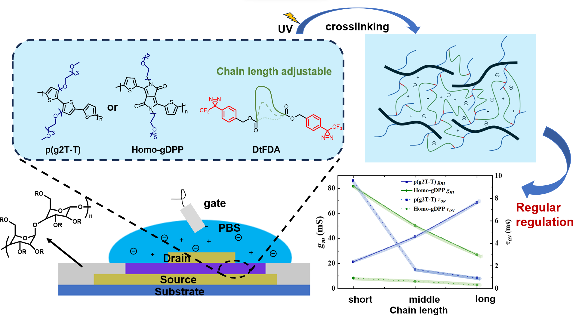 图1. 电化学晶体管沟道中不同链长的交联剂对器件性能产生的影响。