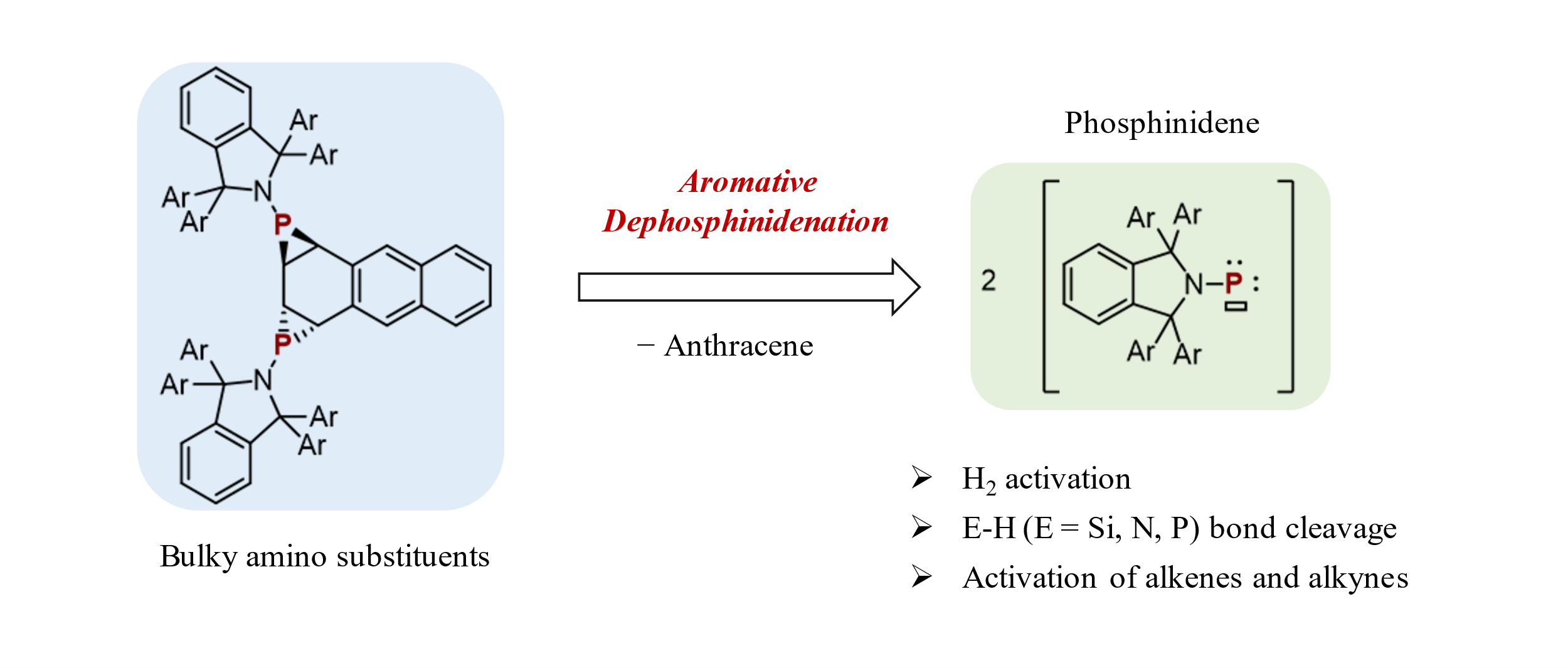 近日,太阳集团2007卢伟课题组报道了一例双磷杂环丙烷并蒽衍生物的合成,该化合物可看成是胺基膦宾中间体与蒽发生[1+2]环加成反应的产物。在加热条件下发生去膦宾芳构化(逆环加成)反应生成蒽和二分子膦宾中间体,该膦宾中间体可迅速发生分子内异构化。此外研究表明,该化合物可作为胺基膦宾转移试剂活化氢气(H2)和元素-氢键(P-H,Si-H和N-H),以及与烯烃和炔烃等不饱和键发生[1+2]环加成反应,构建多种磷杂环化合物。该工作中,卢伟课题组成功合成了双磷杂环丙烷并蒽衍生物,该化合物可作为新型膦宾转移试剂活化多种小分子,并构建一系列含磷化合物。
