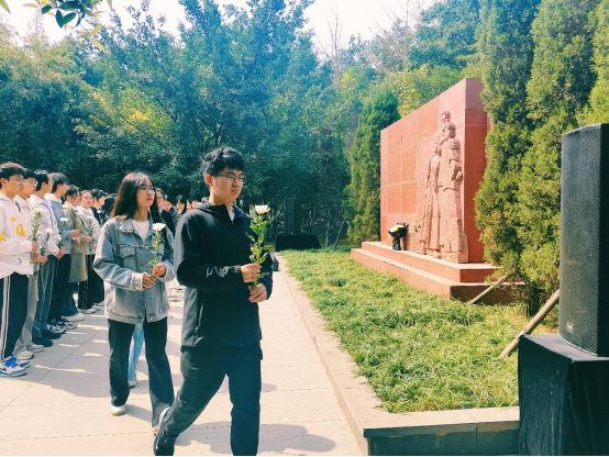 默哀结束后,全体人员手持鲜花,围绕英烈碑绕场一周后将鲜花敬放在英烈碑前。通过诗文朗诵,向先烈表示缅怀和敬仰,全体人员面向英烈纪念碑庄严宣誓,做出“请党放心,强国有我”的庄重承诺。