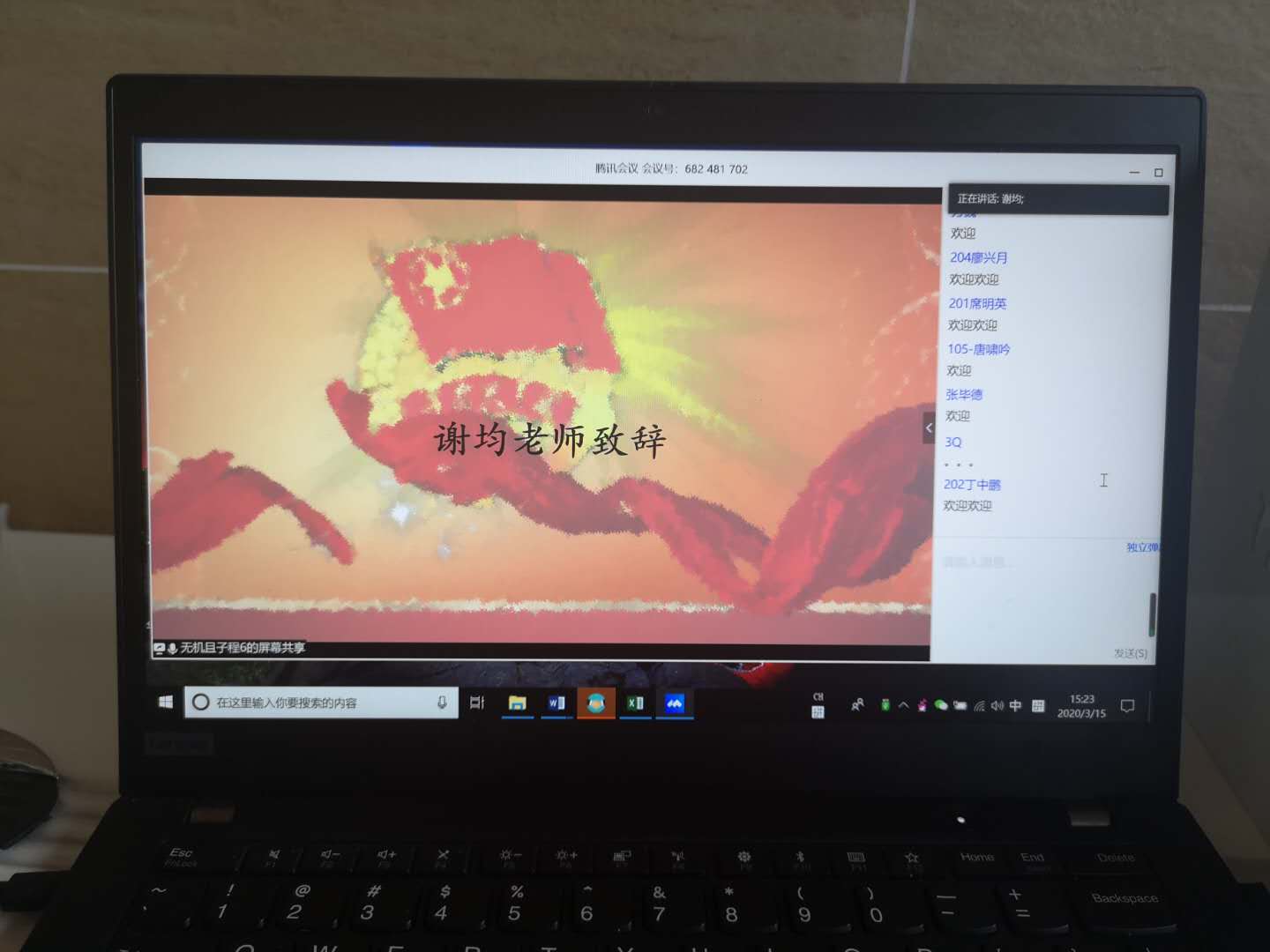 2020年3月15日,化学公司党委副书记谢均老师通过腾讯会议平台以“打赢抗疫攻坚战,书写青春正能量”为主题,为2019级本科员工上了一堂生动的线上思政专题课。