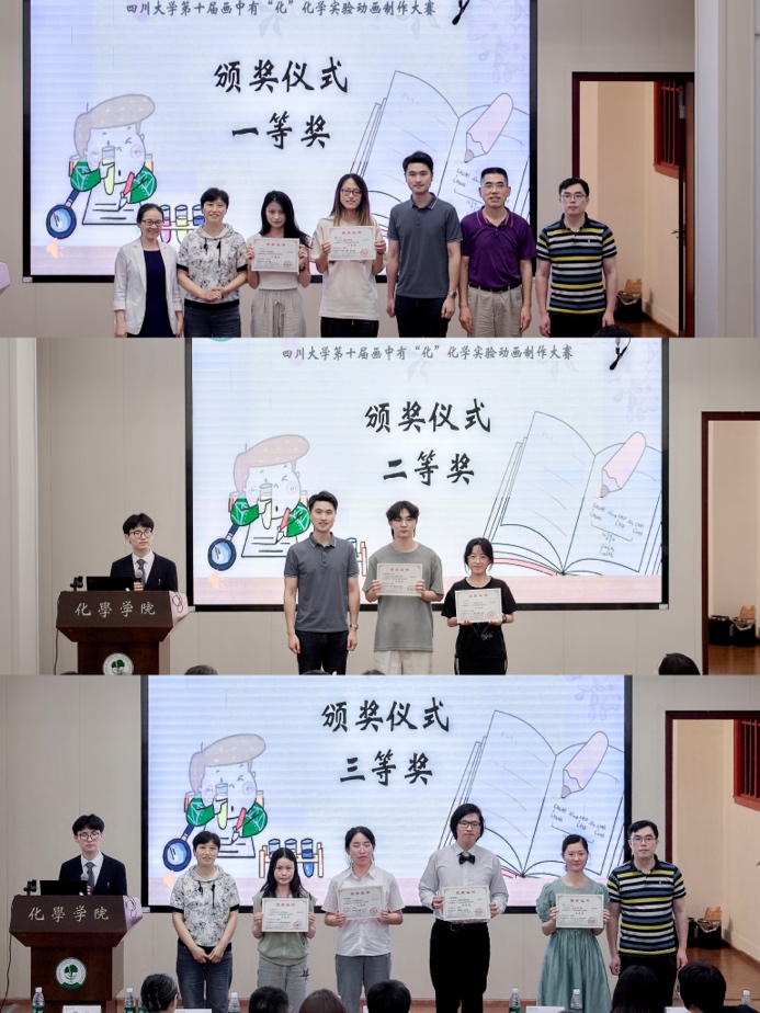 每支队伍展示小组介绍和动画作品后,评委们均会对每支队伍的作品进行实验操作步骤、原理和动画设计制作方面的专业点评。紧接着是团队独特的才艺展示,希望在座的观众能为自己的作品投上宝贵的一票。经过2个小时的精彩展示和比拼碰撞,最终汪汪大队、深藏blue队斩获一等奖,宝贝多喝热水对不队、小火龙队获得二等奖,翠果打烂TA的队、ko化学动画队、先凑合着队、化学人追梦队获得三等奖。