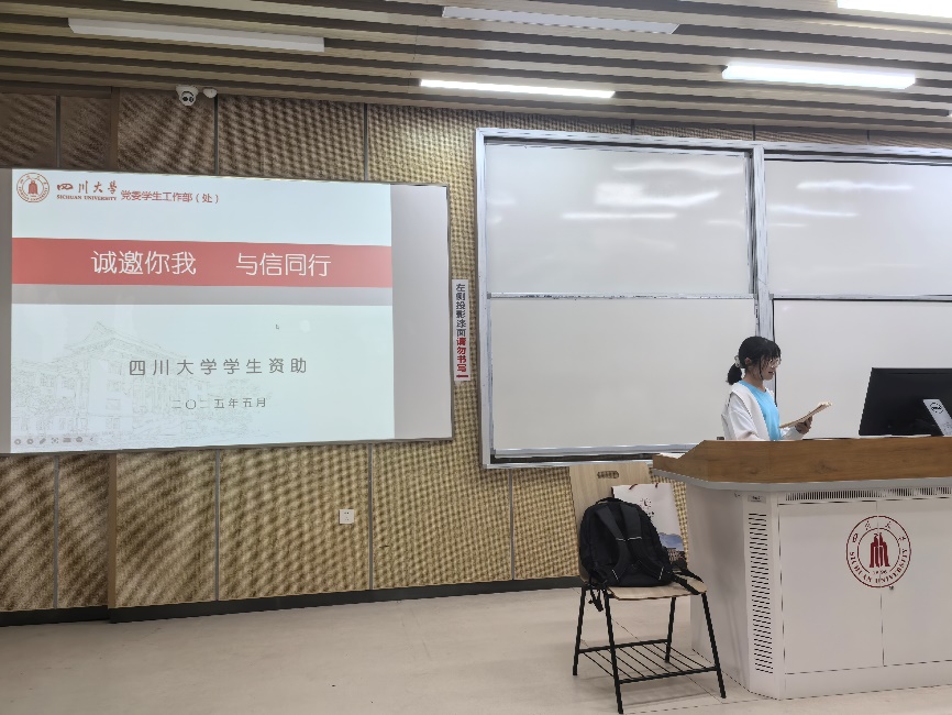 本次宣讲由太阳集团20072024级阳光资助宣传员江万奇和蒲杰主讲,对诚信在资助中的重要性、诚信有关的典型问题、征信知识普及等方面进行了细致地宣讲。其对诚信的价值和重要性做了深刻的阐述,宣讲条理清晰,富有感染力,在座的同学都深有感触,起到了树立员工诚信意识,规范员工诚信做人的目的。