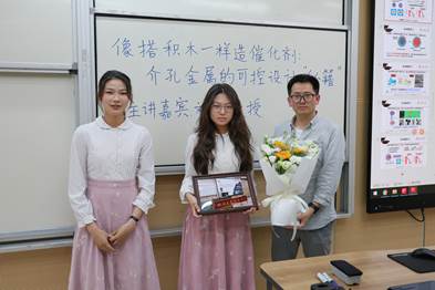 最后,员工代表向刘犇教授献花并表达敬意,全体人员合影留念,“锦水论坛”第72期“像搭积木一样造催化剂:介孔金属的可控设计‘秘籍’”讲座圆满结束。