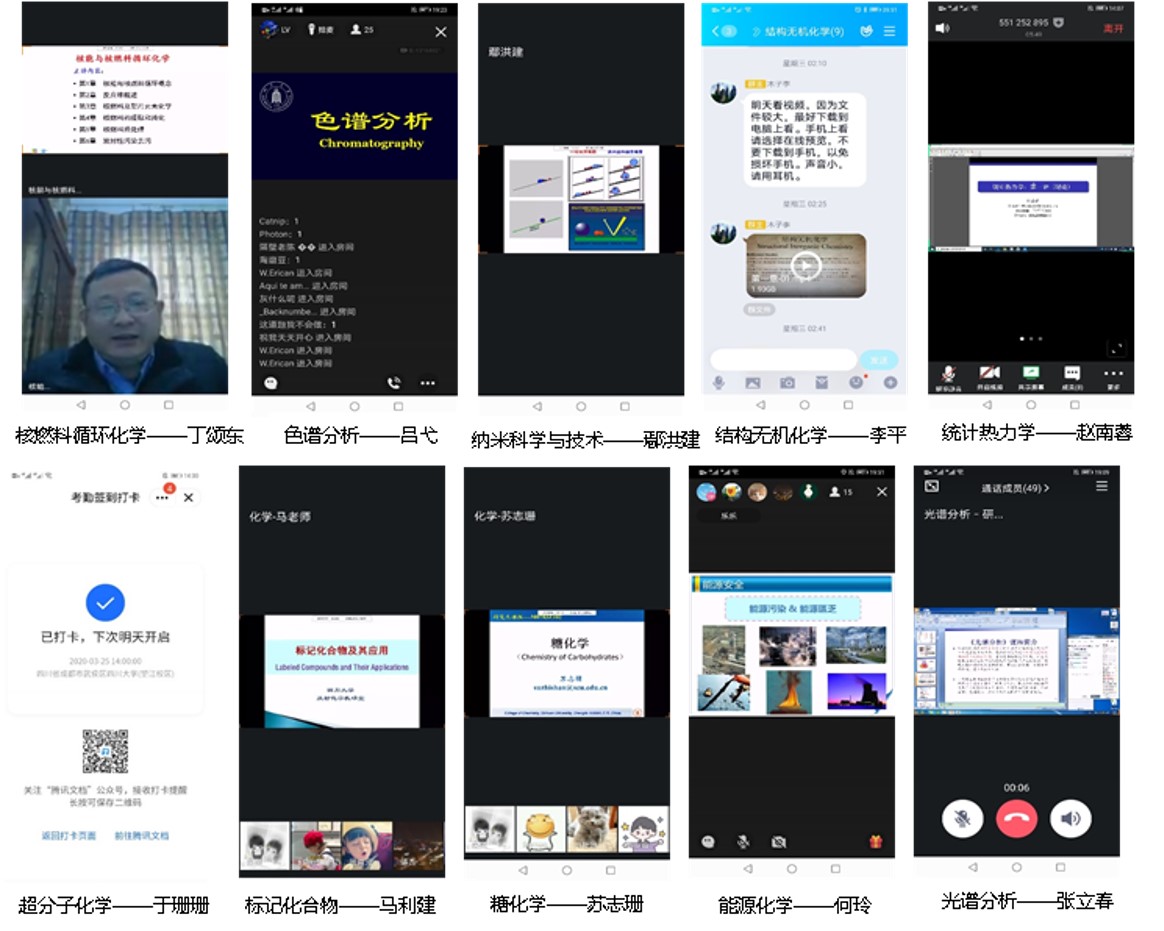 根据教育部和四川省教育厅有关通知要求和学校新型冠状病毒防控工作安排,学院教学与学工口联动对湖北籍同学尤其是毕业生学业情况和生活状况进行了详细的了解,对于上网有困难的同学积极给予帮助。学院积极响应“停课不停教,停课不停学“的号召,本学期研究生专业课程共计有《结构无机化学》、《超分子化学》、《统计热力学》、《标记化合物及其应用》、《糖化学》、《色谱分析》、《纳米科学与技术》、《能源化学》、《光谱分析》和《核燃料循环化学》10门课程成功上线。