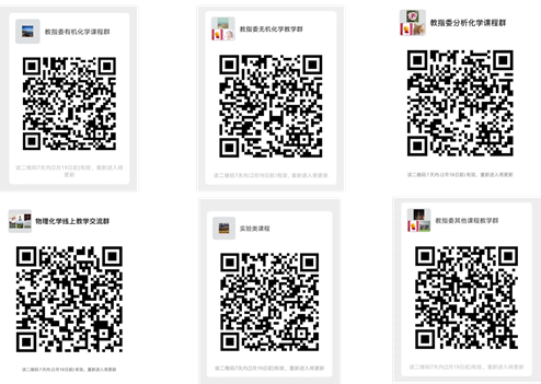 自2019上一学年以来,学院包括院士、杰青等高层次人才在内的全院教师积极投入本科教学,并取得系列成绩如王玉忠院士组织申报《高分子科学导论(双语)》一流课程、国家教学名师胡常伟教授组织申报《大学化学》一流课程;由2位院士、1位杰青为团队建立的《放射化学》成功上线等,为本次线上互动教学打下良好基础。自学校通知以来,老师们通过多层次、多渠道与教育部化学教指委、学校教务处沟通,组织和参与优秀经验平台学习和交流(如图分别为化学教指委各课程的线上教学微信公众号)、产生了一系列优秀案例,如: