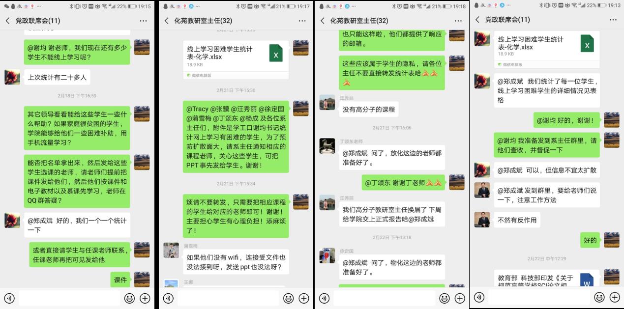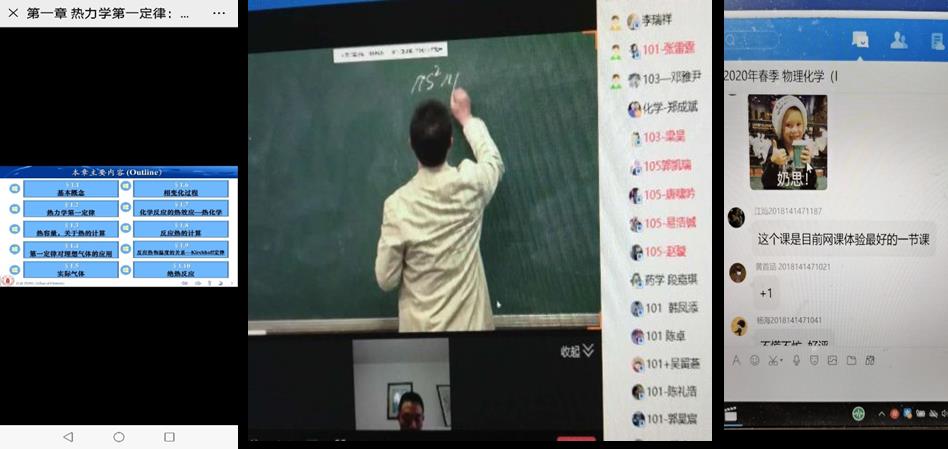 开学第一天(2月24日)学院共有18门线上课程,学院书记、经理等班子成员、各教研室主任、教务口、学工口老师积极参与线上课程听课,确保所有课程听课全覆盖。所有课程均准时开课,授课教师精神状态良好,员工到课率高。老师们提前10-15分钟进入授课平台准备,课程运行良好、顺畅,师生互动有序。为了应对网络拥挤的问题,学院教师积极响应,全部提前上传了课件、电子教材、提出了线上学习的具体要求。童冬梅老师提前录制了在线课程,并分享在员工们喜爱的bilibili平台,运用Camtasia软件对录制课程音效进行后期优化降噪处理。李瑞祥老师在无机化学课堂中采用了录播和直播相结合的模式,让同学们可以更快的融入在线课堂学习。青年教师于立杨讲课风趣,课程设计合理,在线课堂受到了同学们的高度认可。